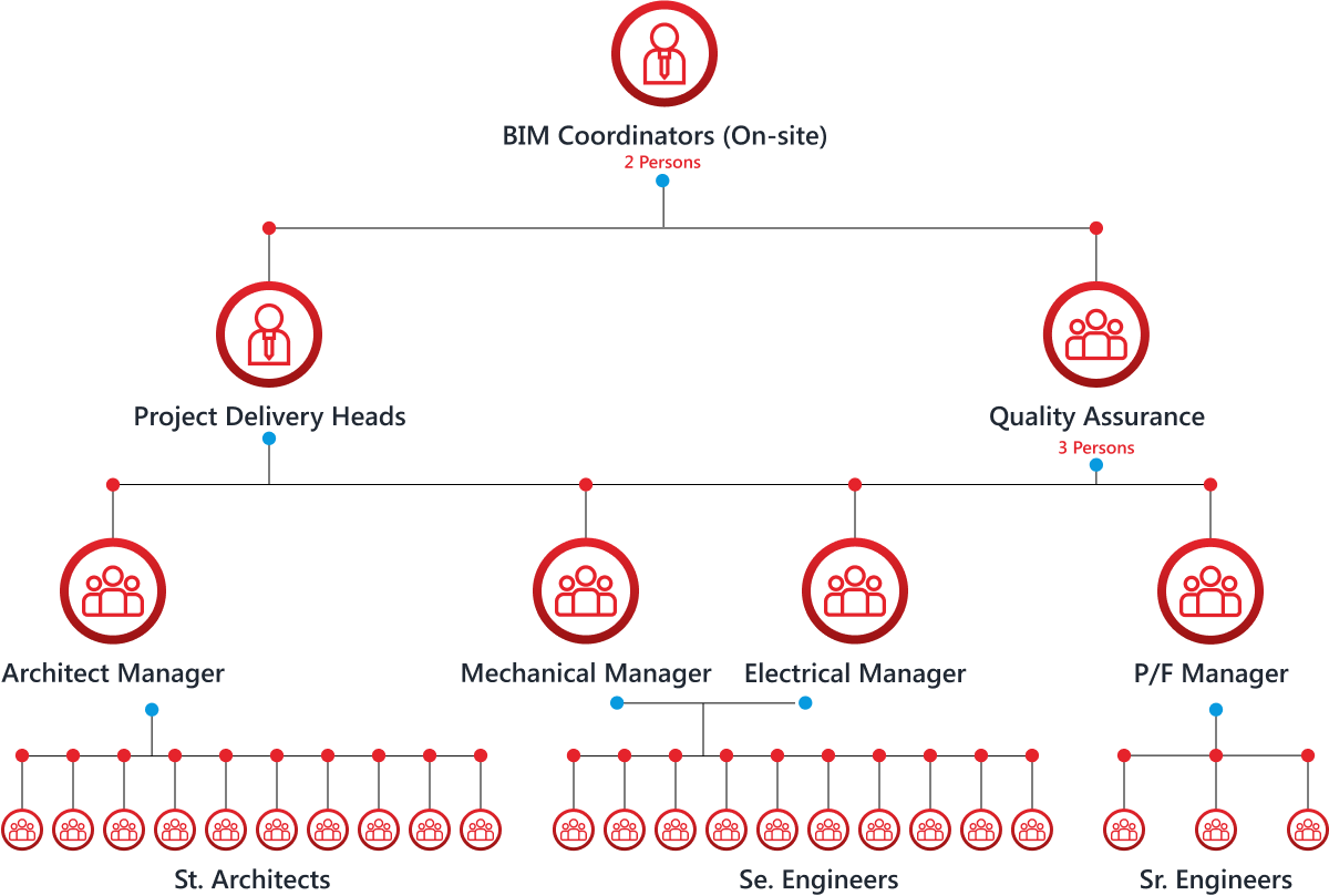 Within a mere 2 months, we facilitated this remarkable growth, achieving an average onboarding time of only 5 days. Our onboarded team markedly enhanced efficiency across drafting, SD, DD, CD sets, modeling, clash detection, and coordination projects.